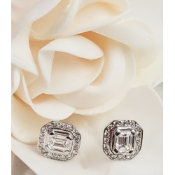 Pendientes realizados en oro blanco de 750 ml. Rubi sintetico facetado oval con orla de circonitas. Dimensiones: 12 mm. x 9 mm Cierre de presión.