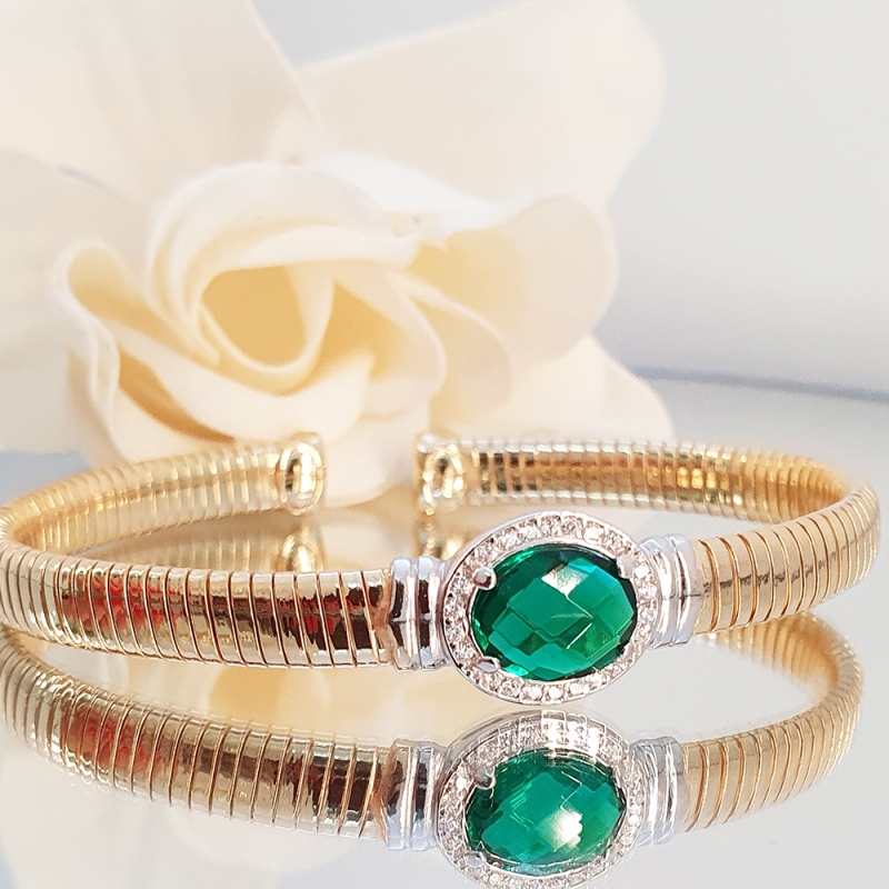 Pulsera de Tubogas realizada en Plata de Ley con baño en Oro y adorno central con cuajado de circonitas rodeando p.verde esmeralda en talla oval facetada. 12 x 10 mm.